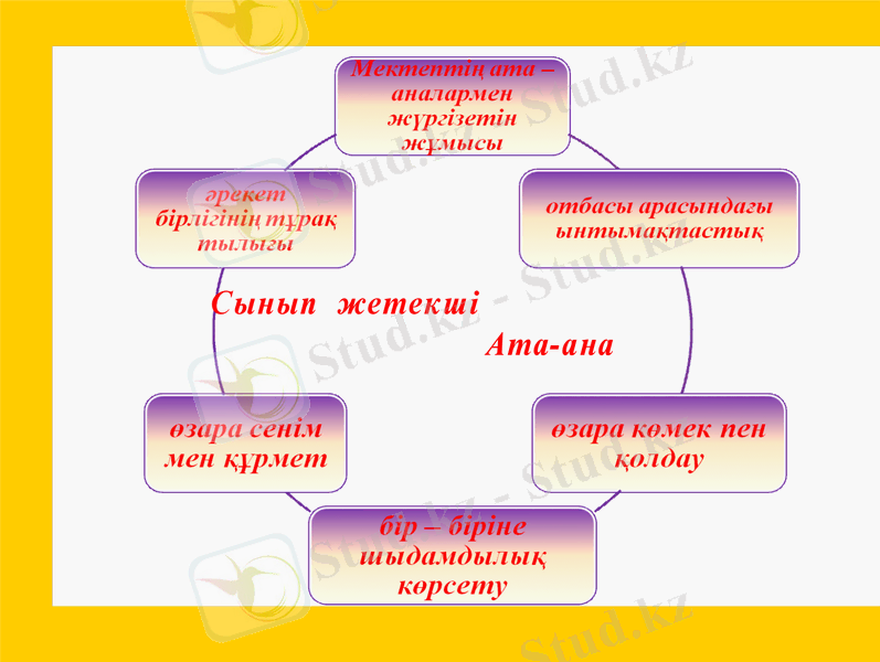 « Жанұя-қорғаным, ата-ана -тірегім » демекші барлық қоғам біткеннің ең арғысы және бірден бір табиғысы-отбасы» деп материалист-философ Жан Жак Руссо айтқандай, қоғам да, мемлекет те үйден, отбасынан басталады. Осыған байланысты мектебімізде баланы өмірге бейімдеуде мектеп, мұғалім және ата-ананың орны бөлек. Сынып жетекшінің тәрбие жұмысындағы бір бағыты ата-аналармен жұмыс жүргізуді ұйымдастыру болып табылады. Сынып жетекші ата-аналармен жұмысты ең алдымен жиналыстан бастайды. Ата-аналар жиналысының бірінші отырысында осы мәселеге қатысты өзінің ұстанымы мен педагогикалық көзқарасын баяндайды. Оның мақсаты мен міндеттерімен, соған орай өзінің әрекет ету бағдарламасы мен тәсілін, тәрбие жоспарымен, ата-аналармен жүргізілетін жұмыстармен таныстырады. Ата-аналармен бірлесіп оны жүзеге асыру жолдарын қарастырады. Мектеп тәжірибесінде сынып жетекші ата-аналарды балалармен бірге әрекеттке қатыстырудың әр түрлі формаларын қолданады. Саяхат, таза ауаға серуен, спорттық жарыстар, жаңа жыл шыршасы, күзгі бал мерекесі, наурыз мейрамдары, оқушылардың жазғы демалыстарын ұйымдастыру т. б. Егер де сынып жетекші мен ата-аналардың байланысы өте тығыз, ұйымшыл болса, бұл шешімін табады.