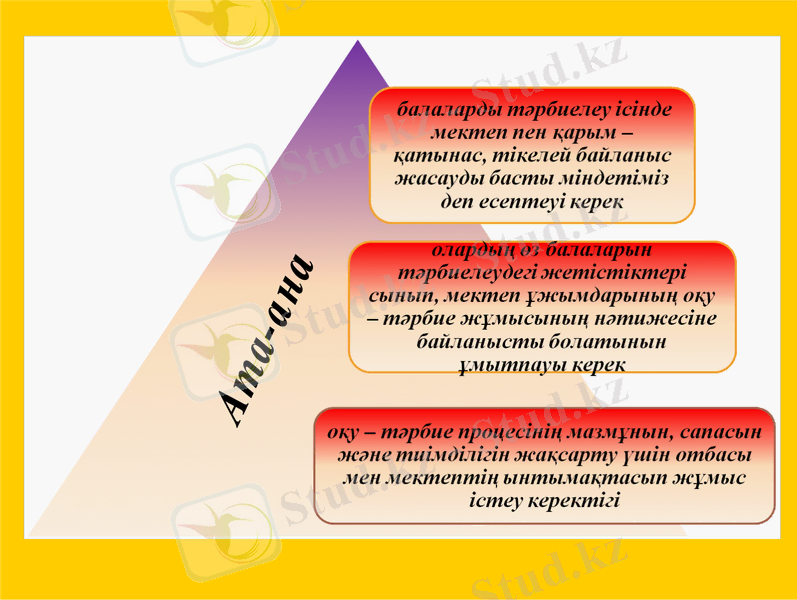 Қорытынды: Мектептің ата - аналармен жүргізетін жұмысының ерекшелігі осы екі жақтың байланысымен әрекет бірлігінің тұрақтылығынан көрінеді. Бұл тұрақтылықты ең алдымен сынып жетекшісі қамтамасыз етеді. Ол мектеп пен отбасы арасындағы ынтымақтастықты ұйымдастыруда жетекші қызмет атқарадыДегенмен, ата-аналармен жұмыс істеу көп ізденуді, еңбек етуді қажет етеді. Әсіресе, сынып жетекшісіне жүктелер жауапкершілік мол. Оны оқушылардың ата - аналарымен тығыз байланыста болған жағдайда ғана талапқа сай жұмыстар жүргізуге болады. Сол үшін де ата - аналармен қоян - қолтық жұмыс істеуі мақсатты түрде өте ұзақ мерзімді қажет ететін процесс.
