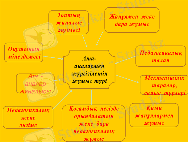 Ата-аналармен жүргізілетін жұмыс неғұрлым тиімді болуы үшін олармен байланыстың әрқилы түрлерін қолдану қажет. Бұдан басқа сыныпта, мектепте болатын кез-келген жұмыстарға мектепішілік іс-шараларға, сынып жетекшілердің ең бірінші қолдап, демеу көрсететін-сынып оқушыларының ата-аналары. Осыған байланысты сынып жетекші ең бірінші сынып ата-аналар төрайымымен және сынып ата-аналарымен тығыз байланыста болуы керек. Кез келген мәселенің жауабы ата-аналармен шешімін табуға тиісті. Осы жоспарды барлық сынып жетекшілері бұл мәселені бірлесіп дұрыс жолға қоя білсе, көптеген жұмыстарымыздан жеңілдіктер байқалар еді.