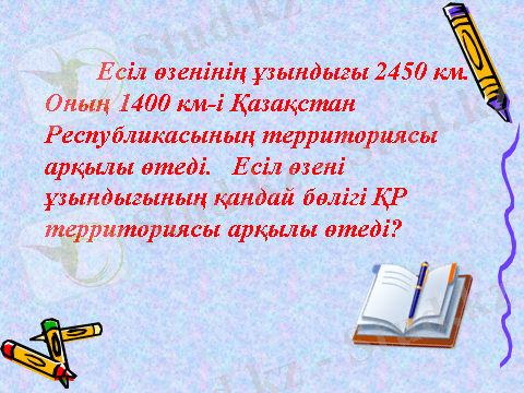 Сөз есеп: Есепті шығарып болғаннан кейін, оқушылардан Есіл өзені туралы қандай ән барын сұрап, музыка тыңдату және Осы Есіл өзені туралы география пәнінің мұғалімі А. Ізтілеуова айтып береді.