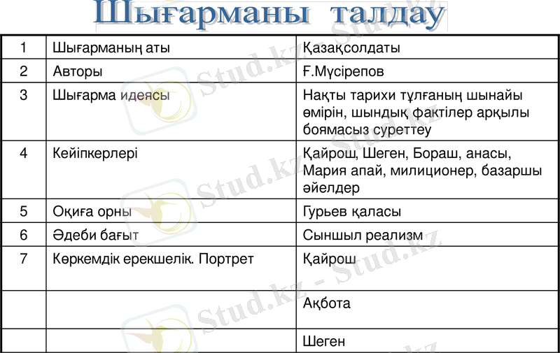 білімдік /образовательная Ғабит Мүсірепов шығармасын оқыту. «Қазақ солдаты» романындағы кейіпкерлер жүйесін талдай отырып, оларға мінездеме беріп, шығарманың идеялық-көркемдік мәнін аша түсу.