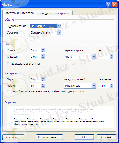батырмасын басу арқылы абзац диологтық терезесін шақыруға болады.
