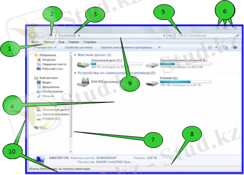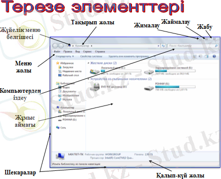 Компьютер қапшығының терезесін мысалға ала отырып, біз терезелердің негізгі элементтерін қарастырайық.
