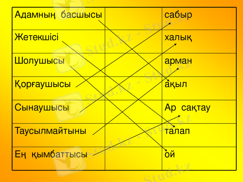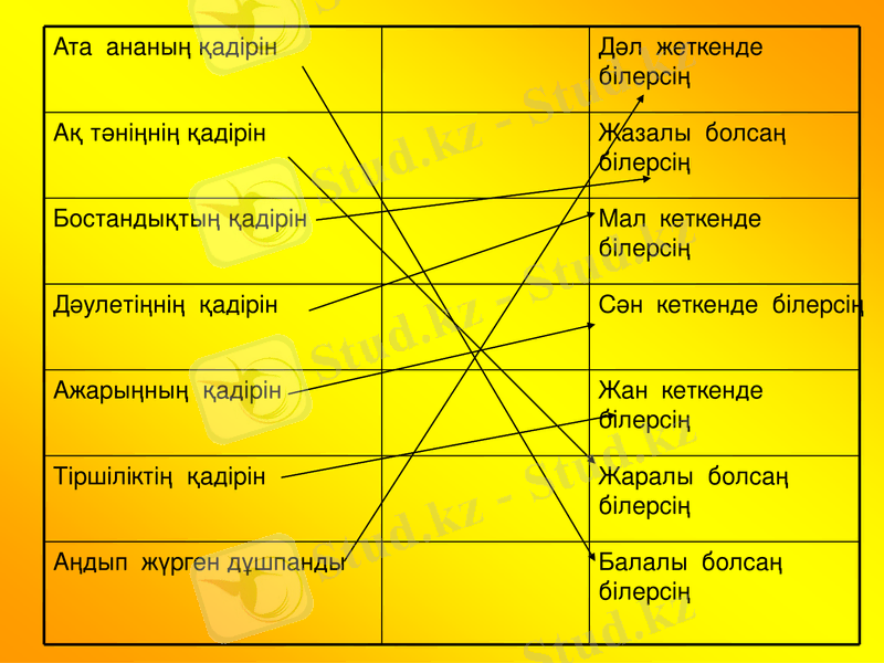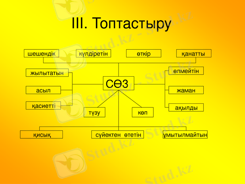 - Сабақтың мақсаты: Шешендік сөздер арқылы оқушыларға адамгершілікті, имандылықты ғибрат ету.