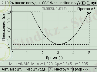 Түсірілгендер көлбеу бойымен жоғары төмен қозғалып келе жатқан арбашаның жылдамдық пен үдеудің уақытқа байланысты жағдайының жобасын көрсетеді. Екінші түсірілім жылдамдықтың уақытқа байланысты сызба көлбеуін көрсетеді (Сызықтық құралдардан) . Соңғы түсірілім белгіленген аймақтағы үдеудің мәнін көрсетеді.