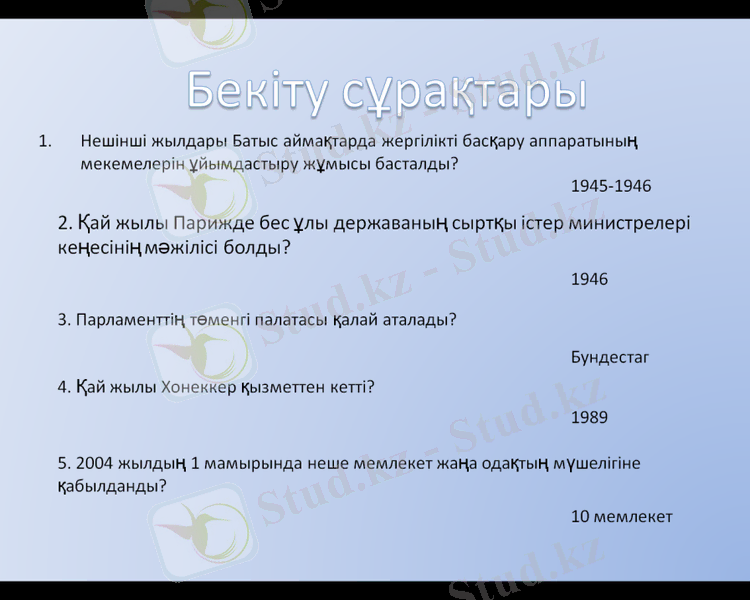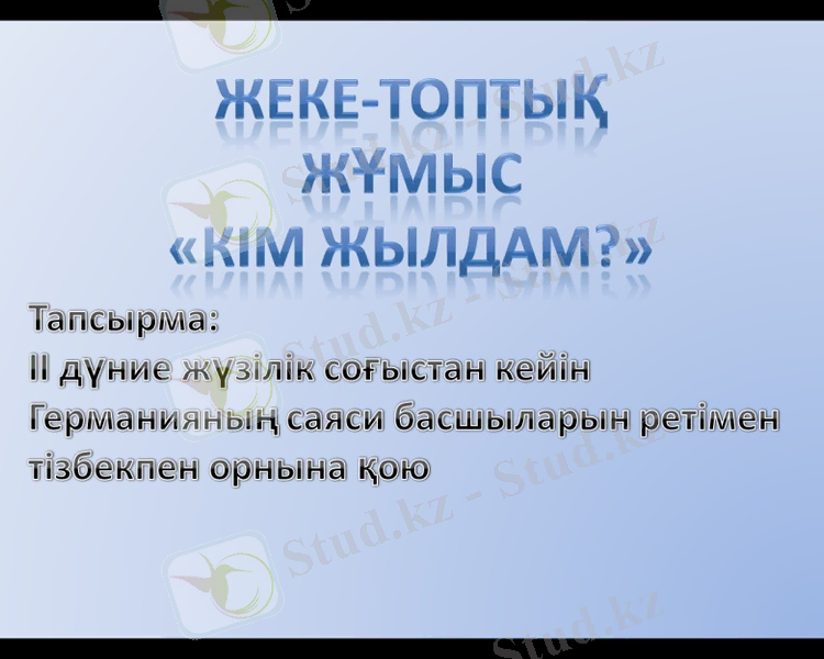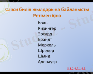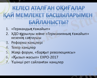 Үй жұмысы: ГФР тақырыбын оқу, Германия мен Қазақстанның арасындағы саяси -экономикалық, мәдени байланыстар жайында мәлімет әкелу.