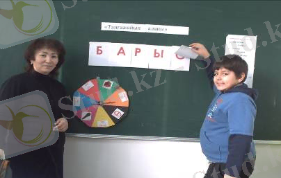 Үш оқушы шығады. Алдарына жеребе тастаймын. Рет сандарын анықталғаннан кейін әр ойыншы кезегімен өздерін таныстырады. Таныстырып болғаннан кейін мен бірінші турдың жасырылған сөзінің сұрағымен таныстырамын. Мына тақтада жасырылған сөзді тапсаңыз 2010 жылдың қазақша жыл атауы шығады (БАРЫС) .
