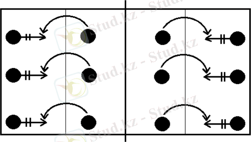9. Жұптасып, тізбектеле орындау: тордың екі жағында қарама-қарсы қатарға тұру, қатардың басында тұрған ойыншылар бір-біріне допты жоғарыдан беріп, тордың астымен өте қарсы қатардың артқы жағына тұру, жаттығу осылай жалғасады.