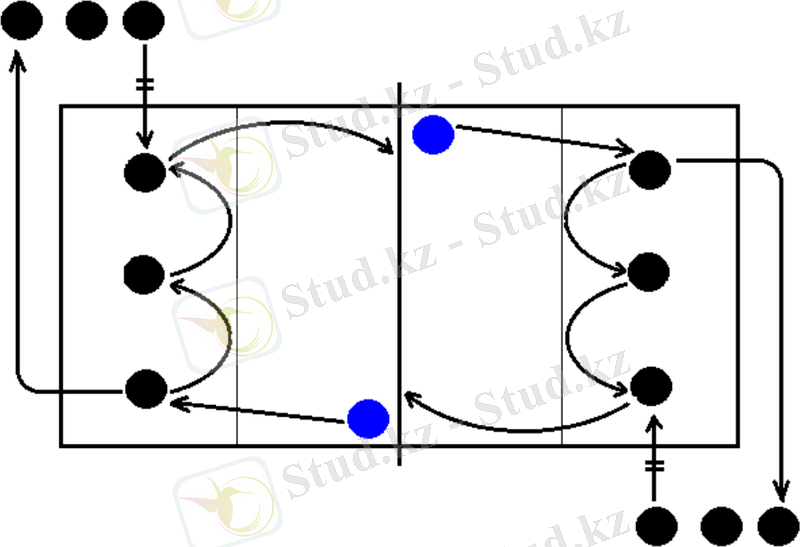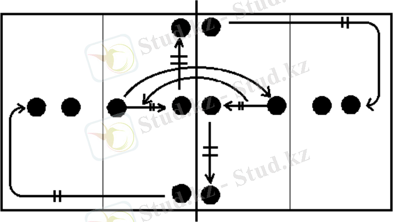 7. Екіге бөлініп, тіке торға бағыт алып, бір немесе екі адым жасап секіре шабуылдау имитациясын жасау, тор маңында тосқауыл имитациясын орындау /тізбектеле орындау әдісі/