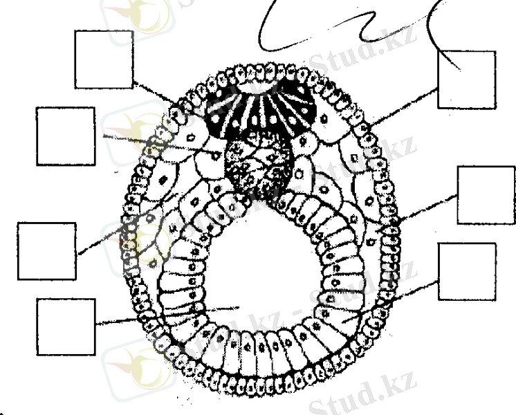 1. Дене қуысы. 2. Ортаңғы қабат 3. Ішек қуысы 4. Хорда 5. Жүйке пластинкасы 6. Сыртқы қабат 7. Ішкі қабат