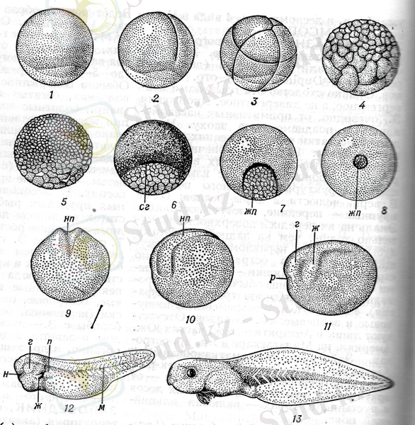 2. Бақа ұрығының даму сатылары сандармен берілген. Солардыың аттарын жаз.
