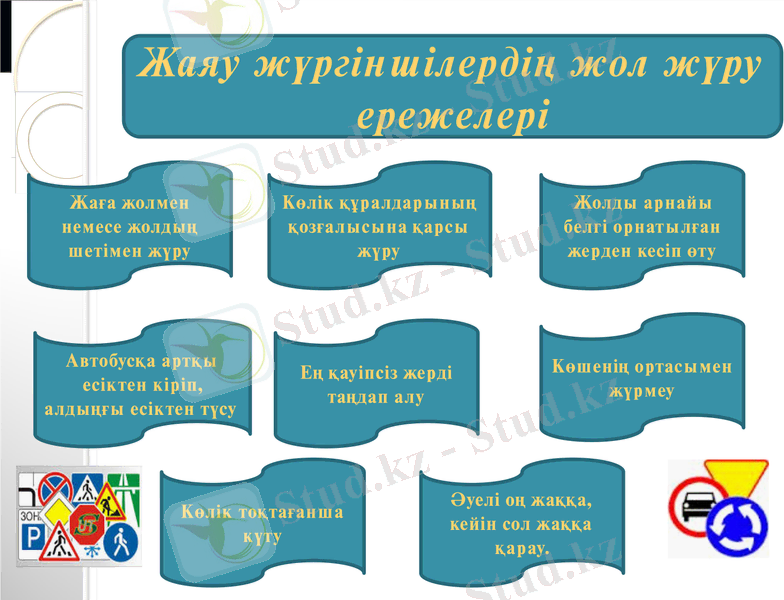 Әдіс - тәсілдері : сұрақ - жауап, топпен жұмыс, ойын, жол белгілерін құрастыру.