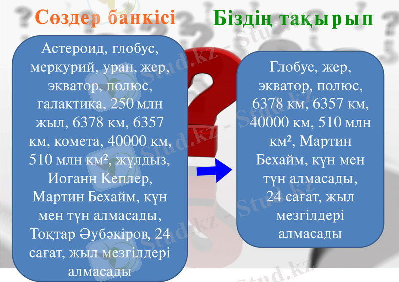 Олай болса біз Жер ғаламшары туралы білімімізді одан әрі тереңдете түсейік. Ол үшін сендер мына сұрақтардың жауабын мәтінді оқи отырып шығарасыңдар.