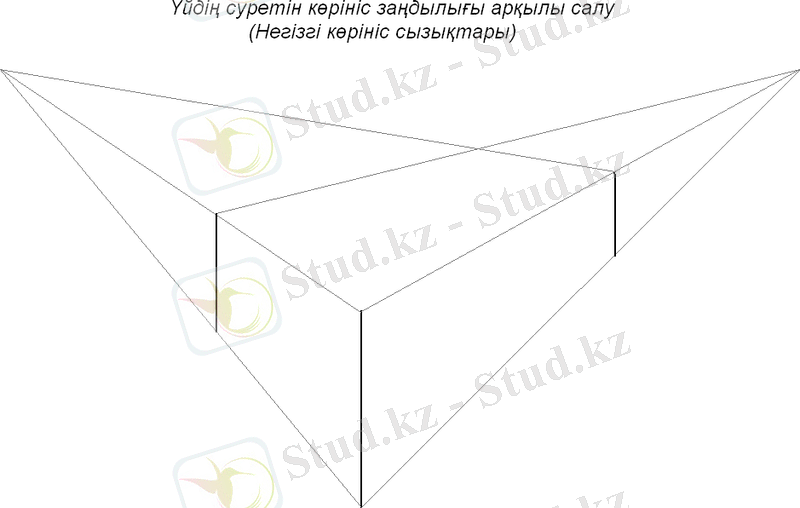 Б) Үйдің суретін салу. Үй жалпы қай жерін алсақ та, геометриялық фигуралардан тұрады. Мысалы: Тіктөртбұрыш, үшбұрыш, ромб, т. б. Үйдің негізгі қабырғаларын куб салған кездегі әдіспен жасап шығамыз. Суретімізді көкжиек сызығын сызудан бастаймыз. Парақтың екі жақ шетінен екі нүкте алып, ортаға үйдің өзімізге ең жақын қабырғасын сызып соның асты мен үстіңгі шетін шеткі нүктемен көкжиек сызығын жасап қосамыз. .