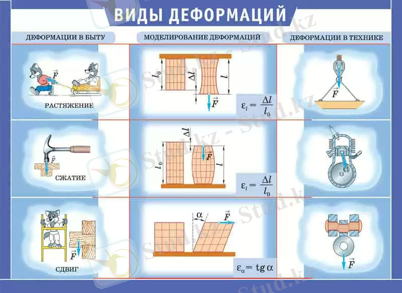 Дене пішінінің немесе өлшемдерінің өзгеруін деформация (латынша деформация - бүліну, бұзылу) деп атайды. өзгертеді Деформация пластикалық және серпімді болып бөлінеді. Күштің әрекеті тоқтағаннан кейін, дене өзінің бастапқы пішіні мен өлшемін өзгертетін болса, мұндай деформация пластикалық деп аталады. Күштің әрекеті тоқтағаннан кейін дененің бастапқы пішіні мен өлшемі қайтадан қалпына келетін болса, мындаіі деформация серпімді деп аталады. Денеге әсер ететін күштердің сипатына қарай деформацияны келесі түрлерге жіктейді: