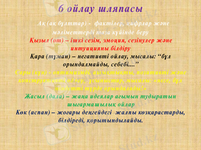 4-тапсырма. Модуль СТО. Әдіс: 6 ойлау шляпасы арқылы жаңа сабақтың негізгі түйіндерін атап шығу. (12 мин)