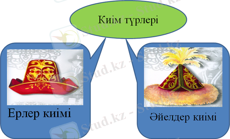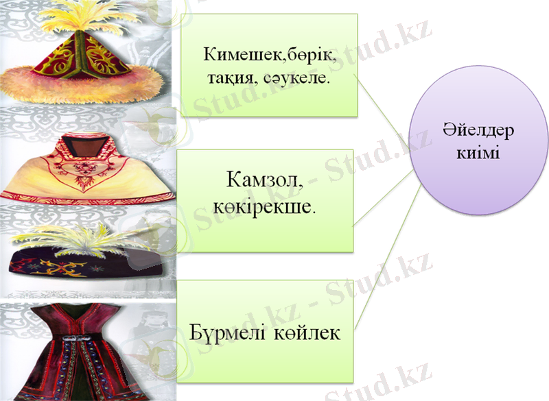 Әйелдер киімдері: сәукеле, бүрмелі көйлек, камзол, кимешек, бөрік, тақия, көкірекше. (слайдқа қарап)