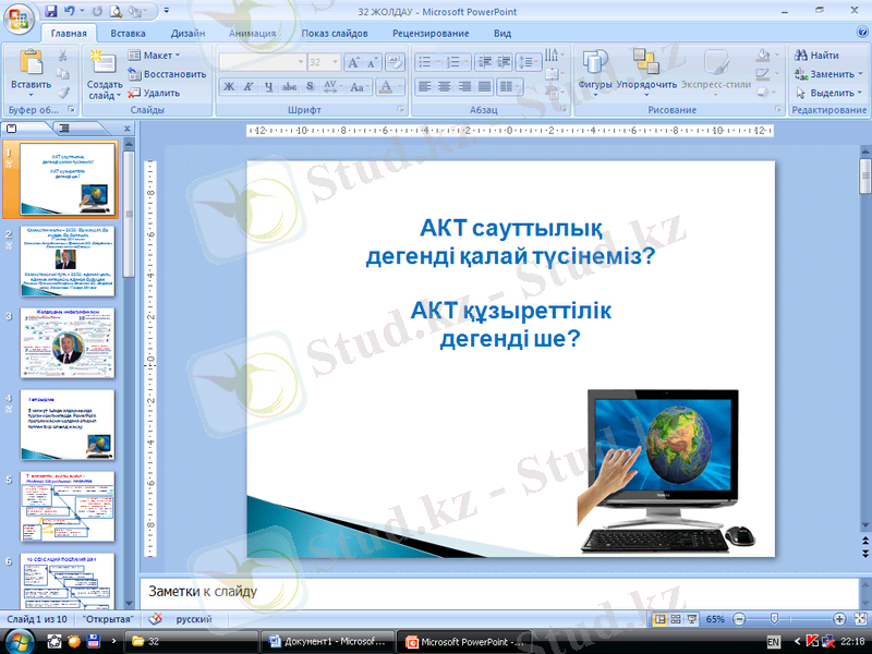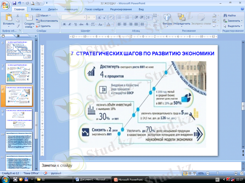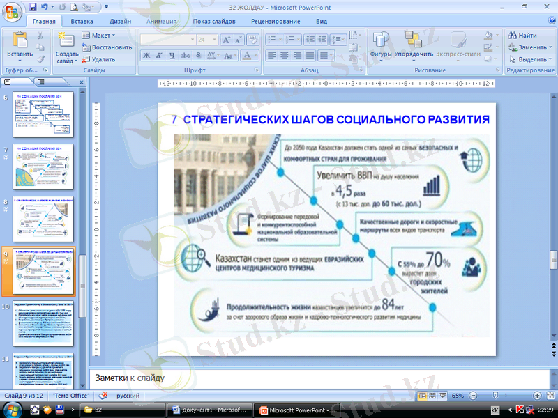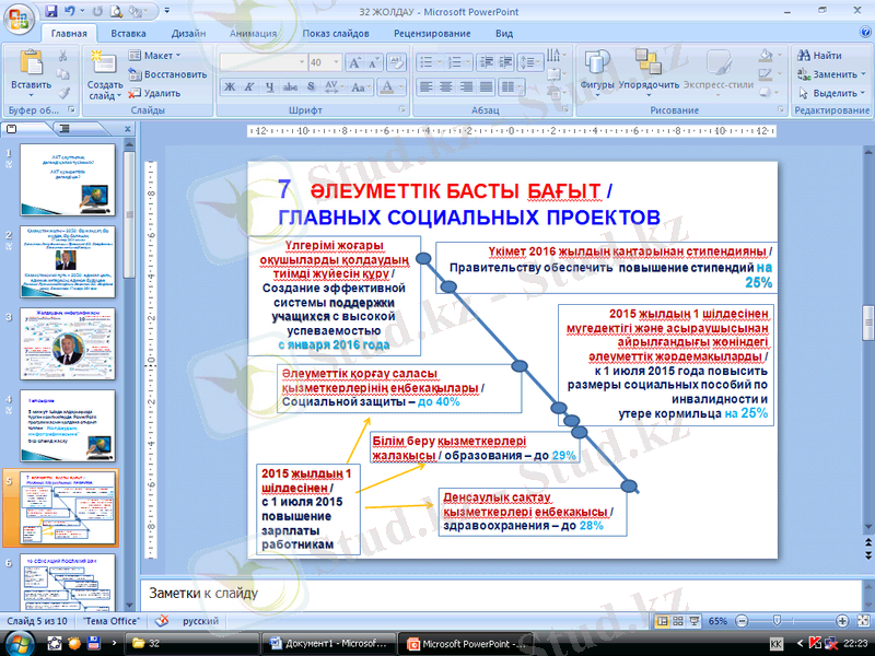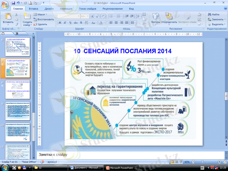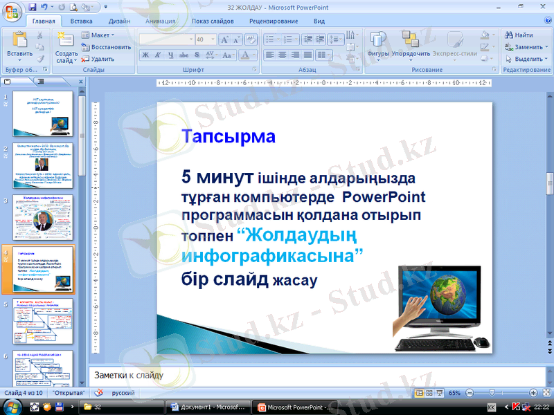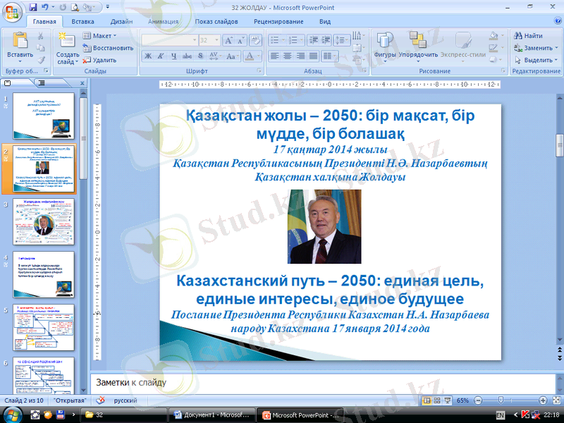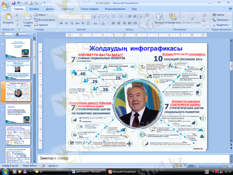 Күтілетін нәтиже: компьютер көмегімен « Қазақстан жолы - 2050: бір мақсат, бір мүдде, бір болашақ» атты 17 қаңтар 2014 жылы Қазақстан Республикасының Президенті Н. Ә. Назарбаевтың Қазақстан халқына Жолдауының инфографикасына слайд жасап қорғау.