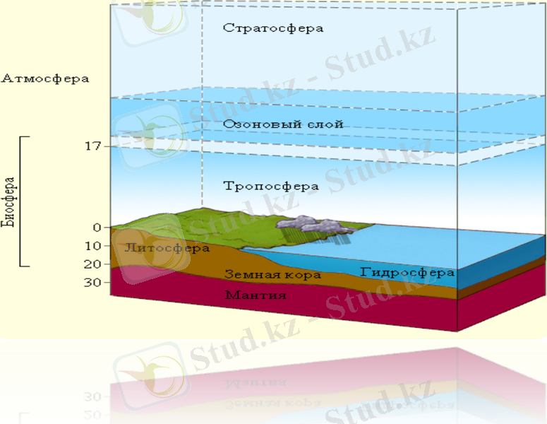 Стротосфера - латынша «stratum» - төсем, тағы сондай сияқты теңіз деңгейінен 9-11 км жоғары жататын атмосфера қабаты. Гидросфера - табиғи су қоймаларынан (мұхиттардан, теңіздерден, көлдерден, өзендерден) құралады. Бұл құрлықтың 70 % алып жатырЛитосфера - жердің қатты қабатыЖоғарыда айтылғандай минералды қабаттардан басқа, жерді ерекше тағы бір қабат - биосфера қоршап тұрады. Ол тірі органимдер тараған аймақтардың бәрін қамтиды. Биосфераның пайда болуымен бірге, жер бетінде тірі организмдер өсіп-өніп, сыртқы қоршаған ортаның эволюциялық дамуына сәйкес Бактериялар атмосфералардың азон қабатында да өсіп-өнеді. Биосферада мол кездесетін микроорганизмдер жер бетінен 50-70 метрге дейінгі биіктікке ғана тарайды.