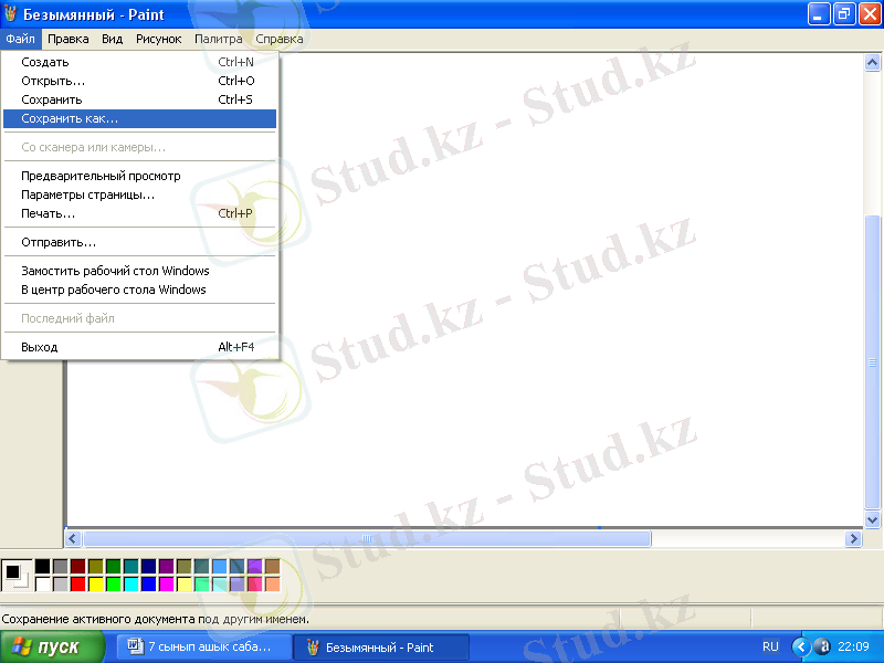 Салған суреттерді, графиктерді қажет кезінде пайдалану үшін, оны дискідегі файлда сақтаған жөн. Файлды дискіде сақтағанда, оған ат беру керек, ал файлды кеңейту Paint-тың bmp программасы автоматты түрде орындайды. Paint программасының құжатын бірінші рет сақтап қою үшін Файл - Сохранить как . . . командасын орындаңдар. Сонда экранда Сохранить как . . . диалогтық терезесі пайда болады. Имя файла өрісінде файлға ат беріп, Сохранить батырмасын шертіңдер.