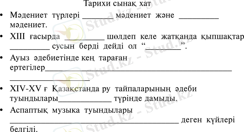 Балалар біз өткен сабақта Отандық трарихтың ең негізгі тарауларының бірі Қазақстанның ХIV-ХV ғасырлардағы мәдениеті тақырыбын өткенбіз, сол тақырыпты қарай меңгергендерінді білу үшін мына сұрақтарға жауап беріп көрейік.