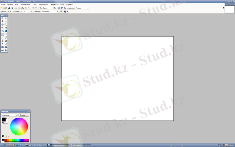 Меню жолы, құрал - саймандар тақтасы, түстер палитрасы, сурет салу алаңы.