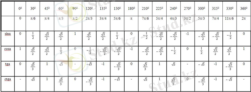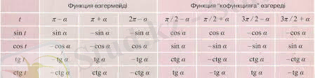 тригонометриялық функциясының әрбір бұрышындағы синустың, косинустың, тангенстің, котангенстің келтіру формулаларымен танысып, осы формулаларды тригонометриялық өрнектерді түрлендіруде және есептерді шығару кезінде қолдануды үйренесіңдер.