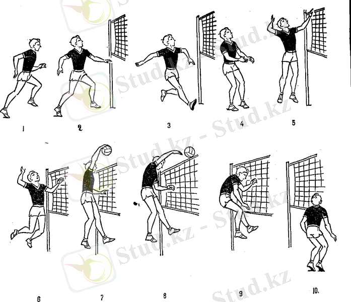 -Тордан 5 - 6 метр жерден жүгіріп келіп қос аяқпен серпіле әуеде секіріп соққы жасау әрекетін көрсету.
