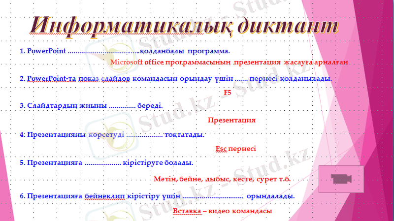 - Оқушылардан өткен Power Point презентациясы тақырыбында информатикалық диктант алу.