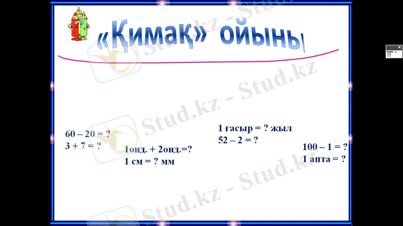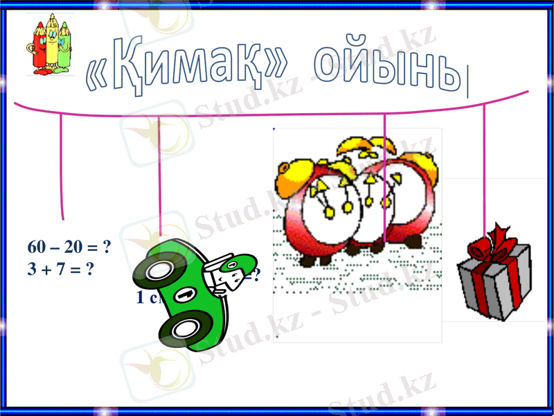 Осы «қимақ» ойынын біз былай ойнаймыз. Слайдта жіпке керілген заттарды таңдап, қиып аламыз. Әр заттың суретіне төмендегі есептер жасырылған. Есепті ауызша шығару керек, дұрыс шығарса ұпай алады.