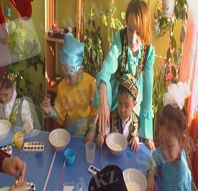 Қажетті көрнекі - құралдар: қазақтың ұлттық бұйымдары, теледидар, сүт, сулы бояу, бау т. б.
