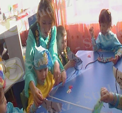 2-орталықтағы тапсырма; Тақияның ою-өрнегіндегі тесікшелер арқылы бауды өткізу.