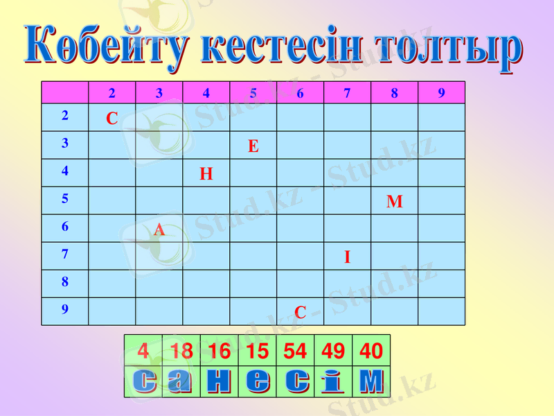 -Балалар экранға назар аударайықшы. Мына берілген көбейту кестесін орындау арқылы бүгінгі сабағымыздың тақырыбын айқындап алуымызға болады екен.