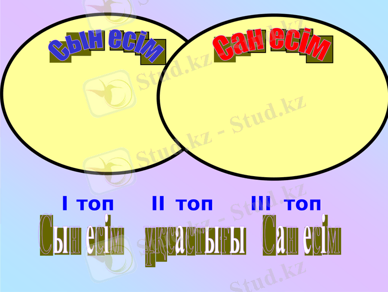 Сонымен бүгінгі сабағымыздың тақырыбы Сан есім. Сан есіммен біз өткен сыныптардан бері таныспыз. Олай болса өткен сабақта өткен сын есім мен сан есімді Венн диаграммасы арқылы салыстырып көрейікші