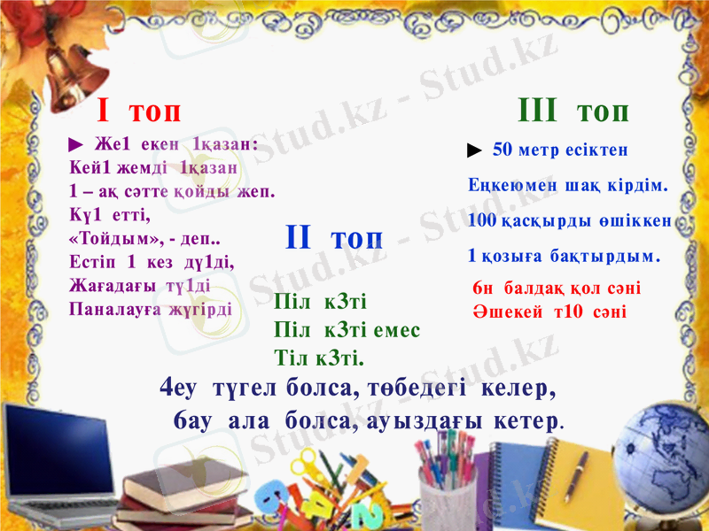 І топ Зат есім ІІ топ Етістік ІІІ топ Сын есім
