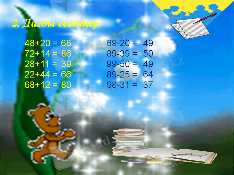 6- слайд бойынша «Дағды есептер» Бұл есептер оқушының жылдам есеп шығара алу мүмкіндігін арттырады. Оқушыларға берілетін уақыт 5-мин. Болғаннан кейін дәптерлерін ауыстырып, бірін-бірі тексереді.