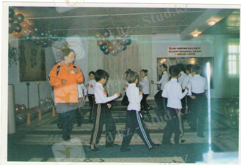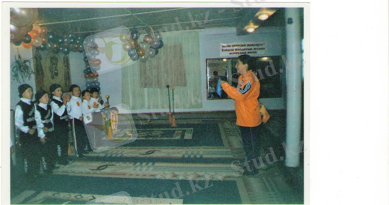 Сабақтың көрнекілігі: Үнтаспа, ленталар, доптар, жалаушалар, бубен, сылдырмақ-