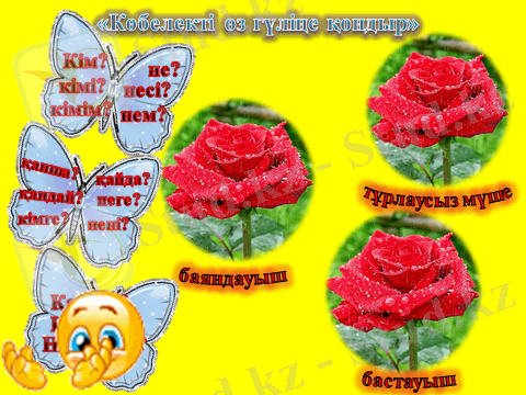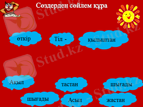 Ойынның шарты: Ойынға қатысушы оқушылар сұрақтарға мақал-мәтелмен жауап беріп, сұрақ орнында тұрған сөз сөйлемнің қай мүшесі екенін жаңылмай айту керек. Барлық сұраққа жаңылмай жауап берген оқушы бастаушы бола алады.