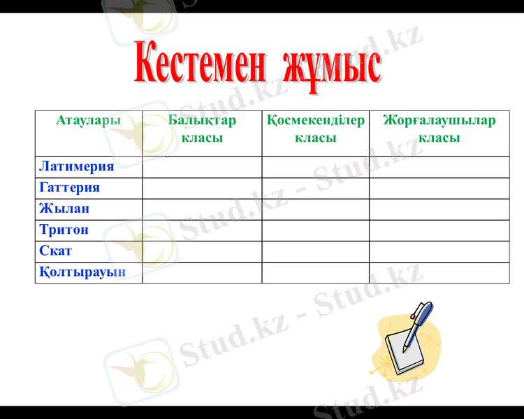 Білімділік мақсаты: Оқушыларға жорғалаушылар туралы сипаттама беру, жорғалаушылардың сыртқы, ішкі құрылысы мен тіршілік әрекетінің ерекшелігін көрсете отырып, жер бетіндегі омыртқалы жануарлармен салыстыру