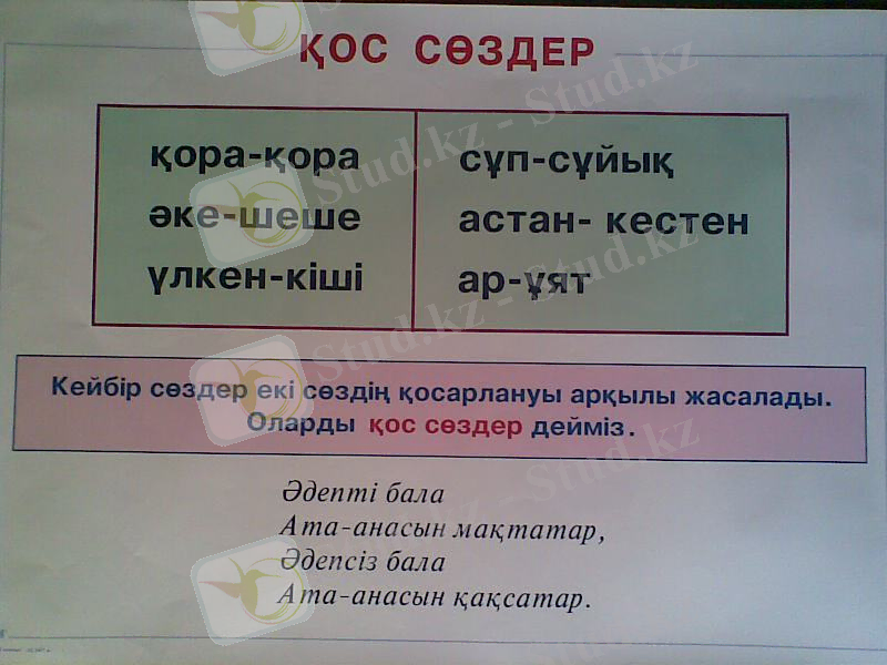 Сабақтың мақсаты: 1. Оқушылардың біріккен сөз, қос сөз туралы білетіндерін пысықтап, білімдерін кеңейту.