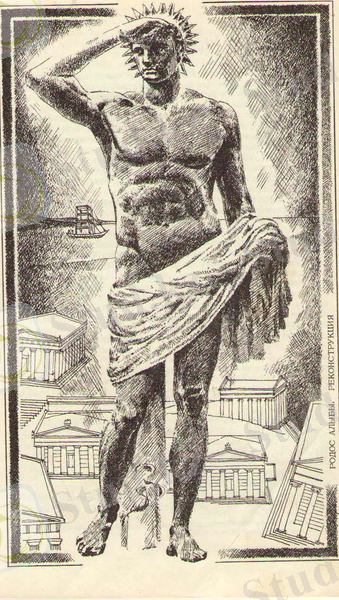 Алып мүсін келім-кетімді кісілер қызықтайтын аралдағы ең басты белгі болып айлақ жағалауында жата береді. Бағы тойған алыпты біздің заманымыздың I ғасырында үлкен Плений келіп көрген. Мүсіннің бас бармағныа ілеуде біреудің ғана құшағы жететіндігі Пленийді қайран қалдырған.