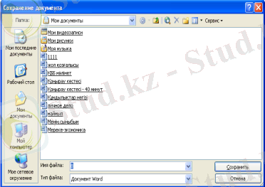 Құжатты бірінші рет сақтағанда Файл менюінен Қалай сақтау . . . командасын таңдаймыз, сонда мынадай Құжатты сақтау диалогтық терезесі пайда болады.
