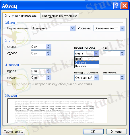 2. Абзацтық шегіністер. Әрбір абзац қызыл жолдан басталатын болады. Ол үшін Формат - Абзац командасын орындау керек. Сонда Отступы и интервалы активтендірілген қосымшасы бар Абзац диалогтік терезесі пайда болады. Сол терезедегі Первая строка жақтауын шерткенде нет, отступ, выступ деген тізім ашылады. Отступ тізімін шертіңдер де, на жақтауында арақашықтықты көрсетіп, ОК батырмасын шерту керек.