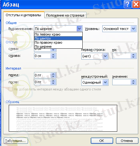 - “по центру” (абзацты бет шеттерінің ортасы бойынша туралайды) ;