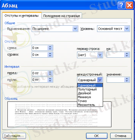 4. Жоларалық интервал - абзацтағы жолдардың арақашықтығы. Жолдардың арақашықтығын өзгерту үшін Формат - Абзац командасын орындау керек, Сонда Отступы и интервалы активтендірілген қосымшасы бар Абзац диалогтік терезесі пайда болады. Сол терезедегі межстрочный жақтауын шерткенде ординарный, двойной, полутарный, точно, множитель тізімі ашылады. Жодардың арақашықтығын өзгертуге қажетті түрін таңдап, ОК батырмасын шерту керек.