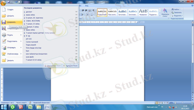 - Негізгі менюденЖіберу → Бағдарламалар→ Microsoft Office → MS Wordкомандаларын орындау арқылы;