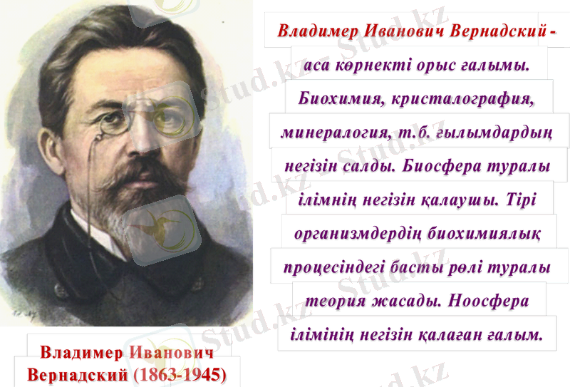 Биосфера жөніндегі алғашқы ғылыми ой-пікірлер атақты орыс ғалымы . . . еңбектерінде де кездеседі.