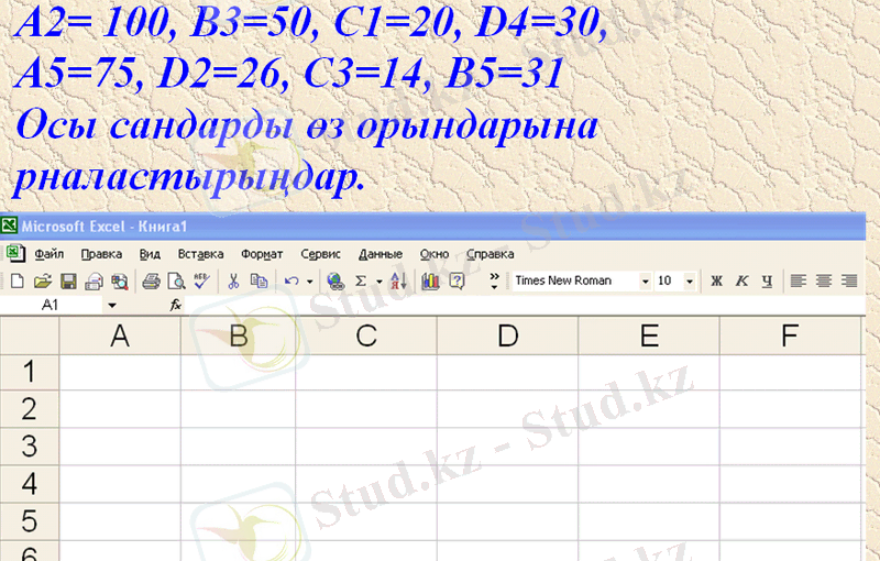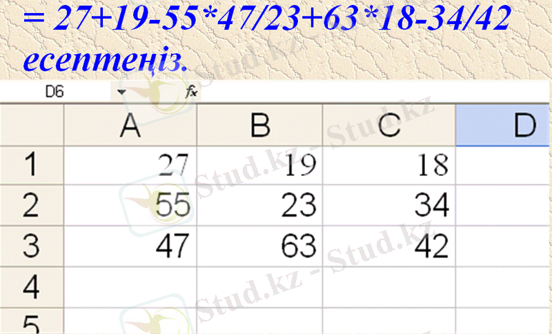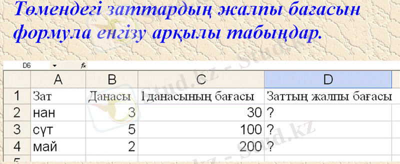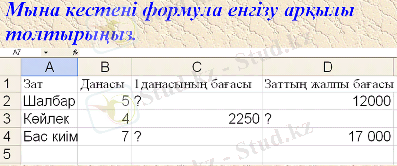 К естенің ұяшығына мәтін енгізгенде көбінесе мәтін ұяшық шекарасына сыймай қалады. Бағанның енін маустың көмегімен өзгертуге болады немесе Формат-Строка (Столбец) -Ширина командасын таңдау керек.