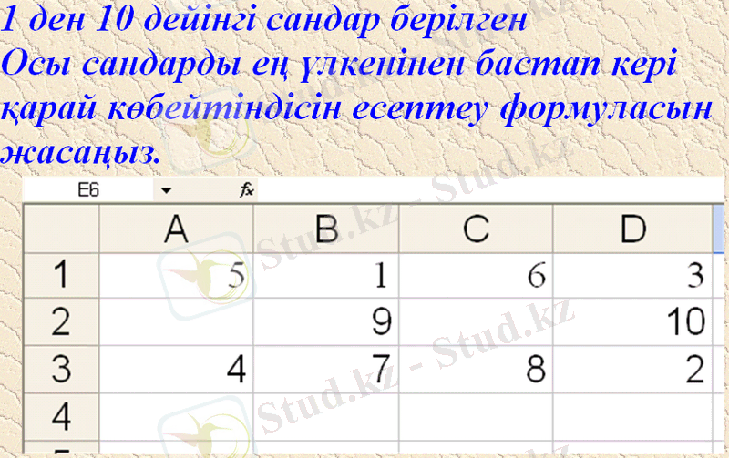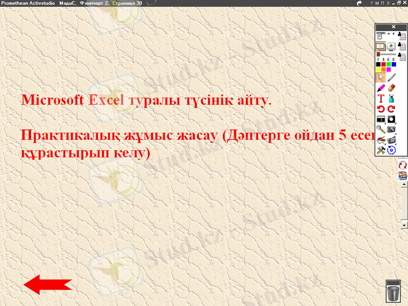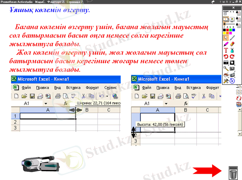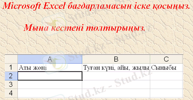 Білімділік: EXCEL КЕСТЕЛІК ПРОЦЕССОРЫ, НЕГІЗГІ ТҮСІНІКТЕР МЕН АМАЛДАР, EXCEL мүмкіндіктері, жұмыс кестесінің элементтері, бағанның енін және жолдың биіктігін өзгерту туралы білімдерін қалыптастыру;