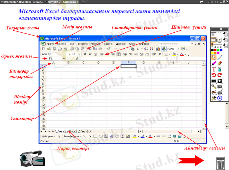 Microsoft Excel бағдарламасының терезесі мына злементерден тұрады: